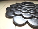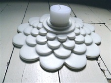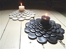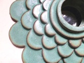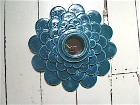 In brown or white stoneware, the Sunburst Mirrors and Candle Holders are glazed in the following colors: Black with bronze sheen, Organic Green, White Matte or Pearlywinkle Blue. Each unique piece is signed and approximately 9” in diameter with a depth of 1.25”.